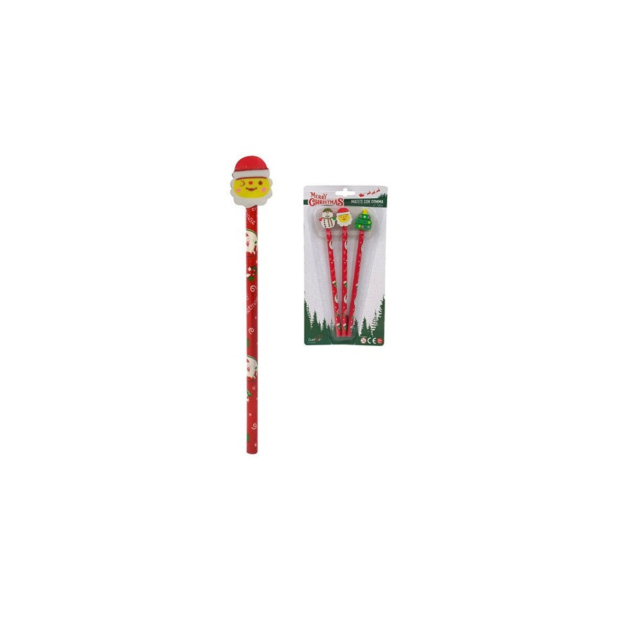 Confezione di 3 matite assortita in vari soggetti natalizi, con gomma da cancellare.