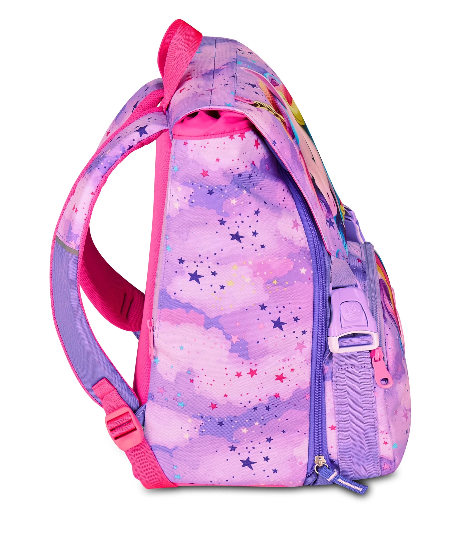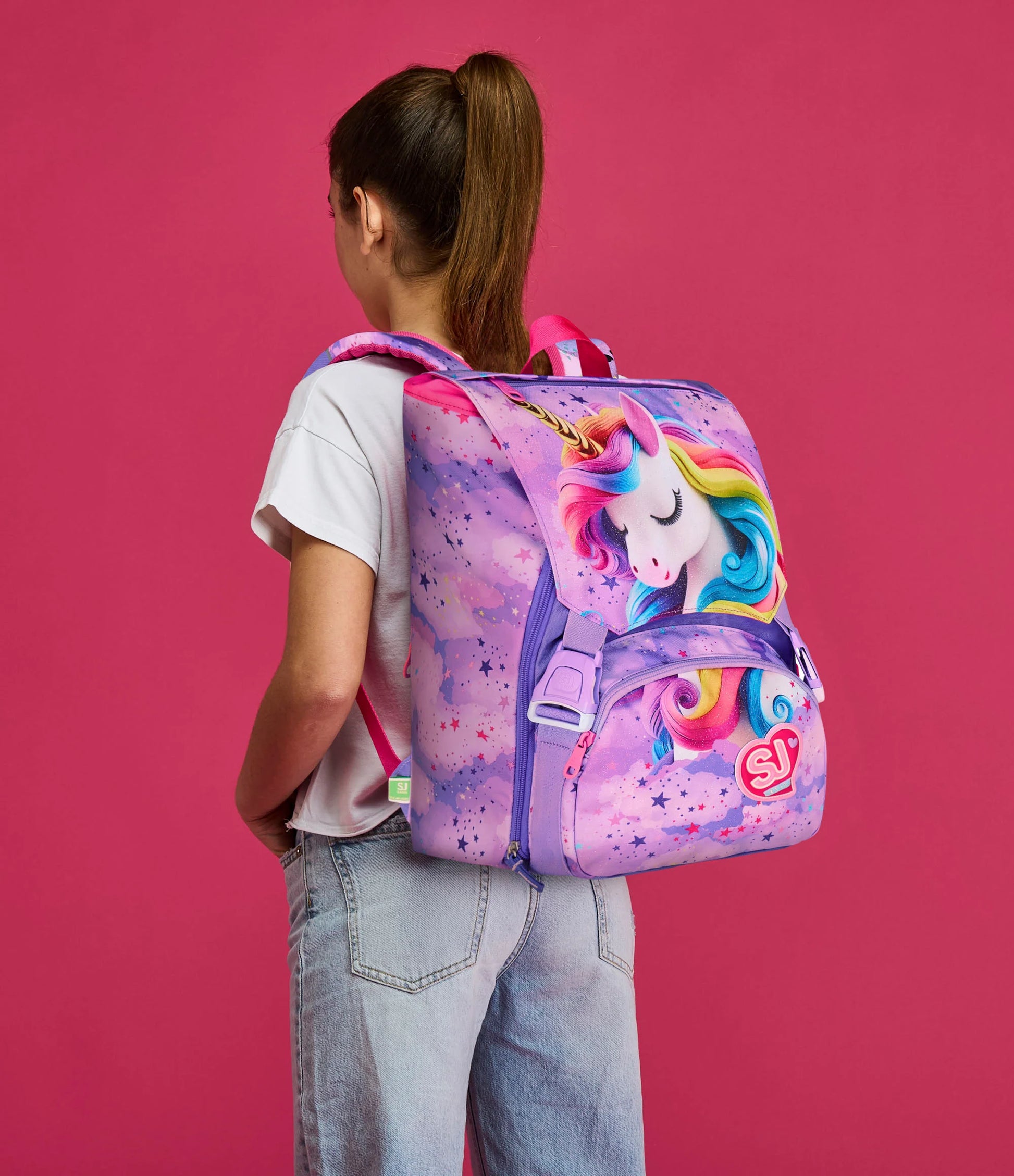 Ciao! Sono il favoloso FABLE JOURNEY, lo zaino estensibile SJ GANG con finitura scintillante per andare a scuola e giocare! Apri le zip laterali e sfodera i MAXI INSERTI stampati per trasformarmi in un meraviglioso UNICORNO ALATO! Ho un doppio scomparto spazioso, di cui puoi aumentare facilmente la capienza tramite le zip laterali per poter accogliere e distribuire in modo ottimale libri, quaderni e tutto ciò che ti serve per la tua giornata, potendo sfruttare anche la tasca frontale. Inoltre, sono davvero comodo da indossare sulle spalle, grazie a schienale e spallacci confortevoli. In più, il fondo integrato mantiene la mia struttura inalterata, garantendo la stabilità del contenuto anche a pieno carico.
