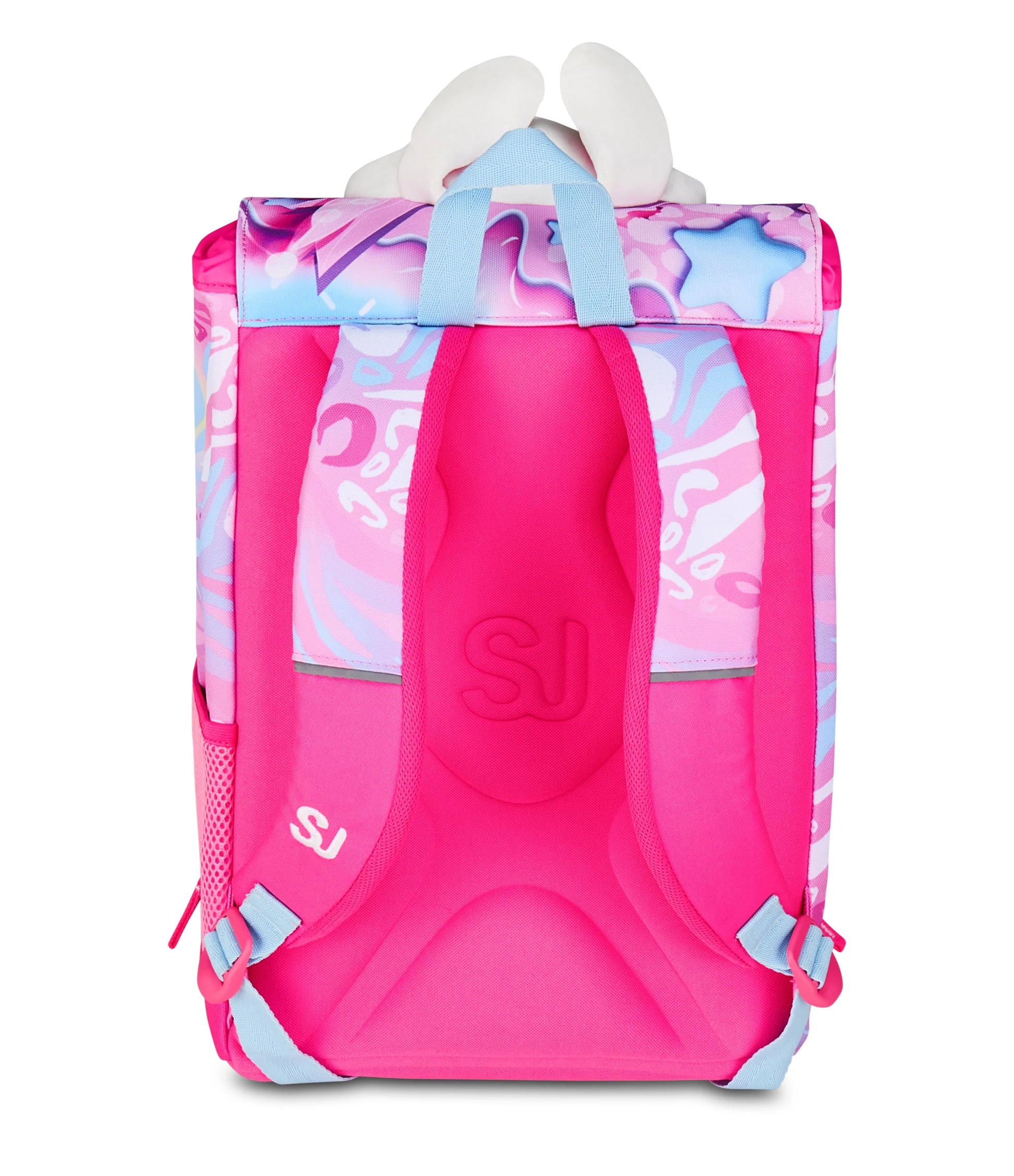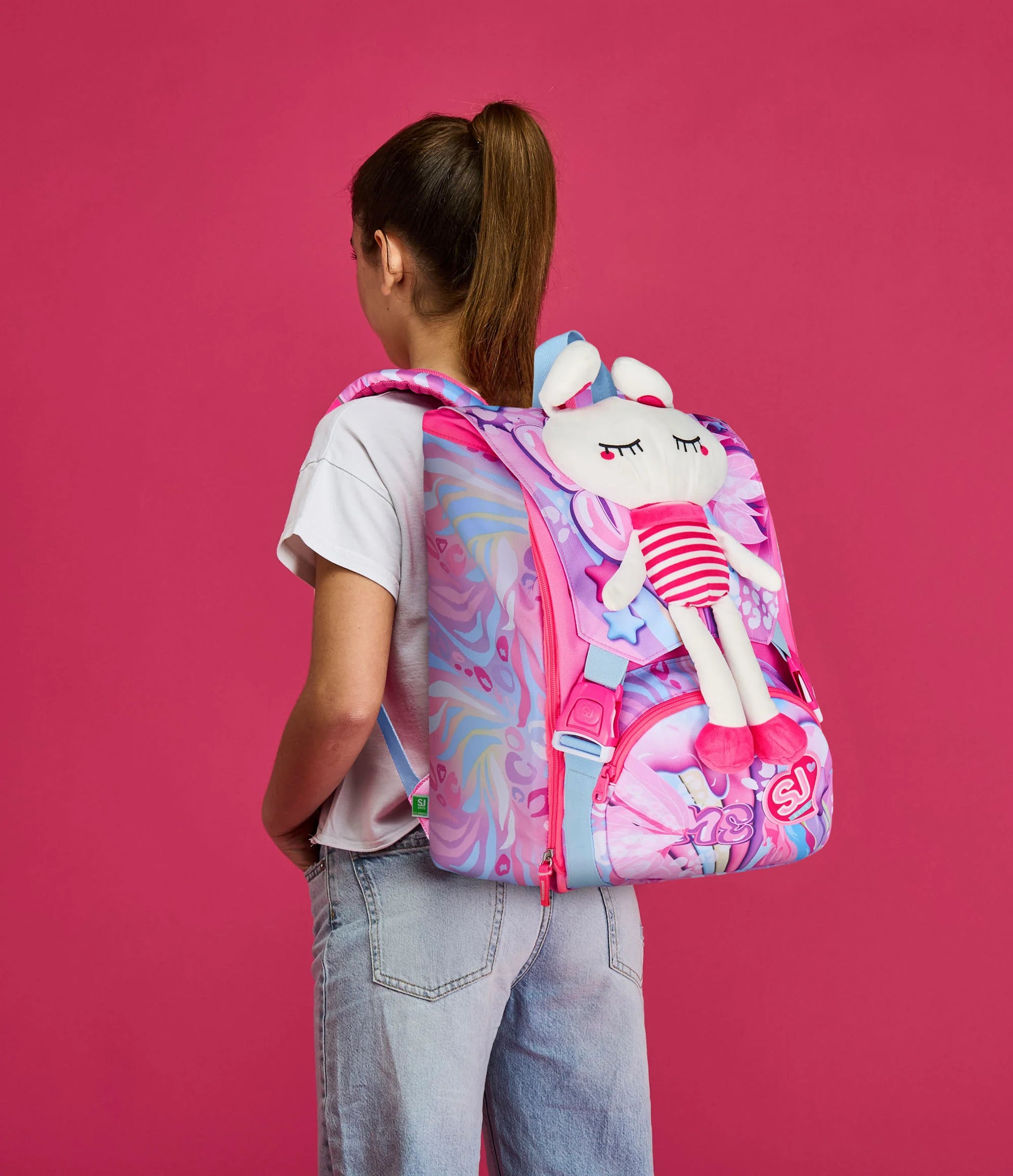 Ciao! Sono PLUSHY RABBIT, lo zaino estensibile SJ GANG con cui vai a scuola e con cui puoi giocare sollevando le ORECCHIE del tenero CONIGLIETTO DI PELUCHE! Ho un doppio scomparto spazioso, di cui puoi aumentare facilmente la capienza tramite le zip laterali per poter accogliere e distribuire in modo ottimale libri, quaderni e tutto ciò che ti serve per la tua giornata, potendo sfruttare anche la tasca frontale. Inoltre, sono davvero comodo da indossare sulle spalle, grazie a schienale e spallacci confortevoli. In più, il fondo integrato mantiene la mia struttura inalterata, garantendo la stabilità del contenuto anche a pieno carico.